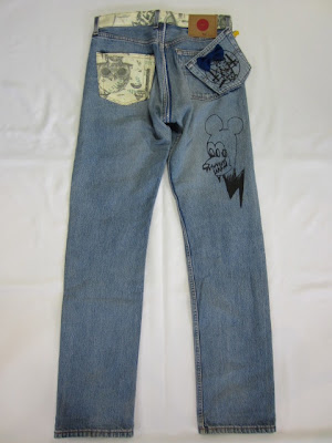 古着のデニムパンツに小人達のプリント、そこにプラスティックの人形達の目が付属。