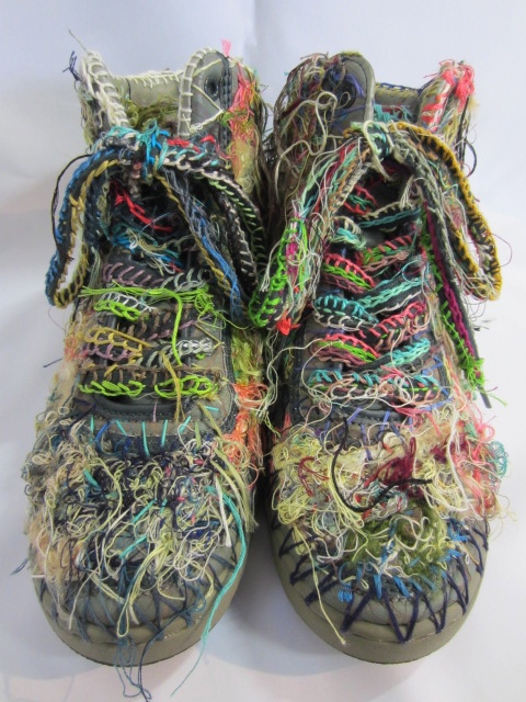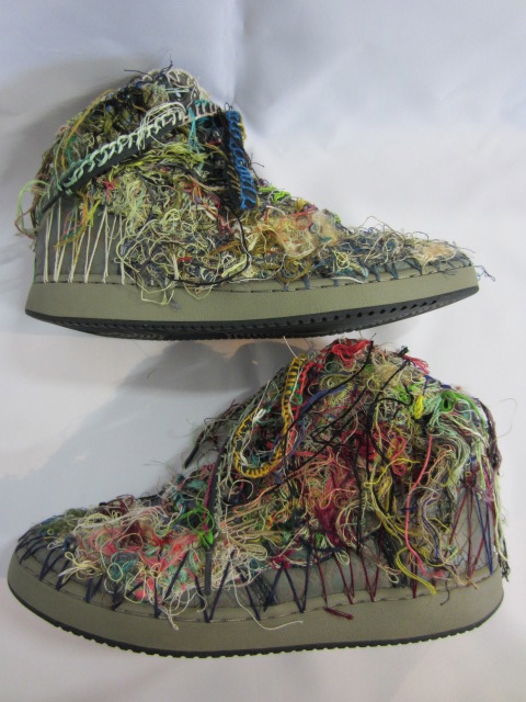 カーキとグレーの色合いをベースにしたシューズが、ベージュや色とりどりの糸達に覆われました。