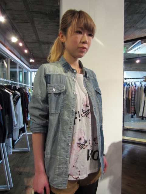 『ANREALAGE』デニムパッチワークシャツ 44,100円『FAIR GROUND』Woof Woof Singlet Dress/プードルプリントタンク 6,300円『EVIL TWIN』”War Paint” ショートパンツ 11,340円『MESSECA(メセカ)』CORALINE A グリッターウェッジソールシューズ 26,250円『FAIR GROUND』Bag of Tricks ポニー柄トートBAG 9,450円