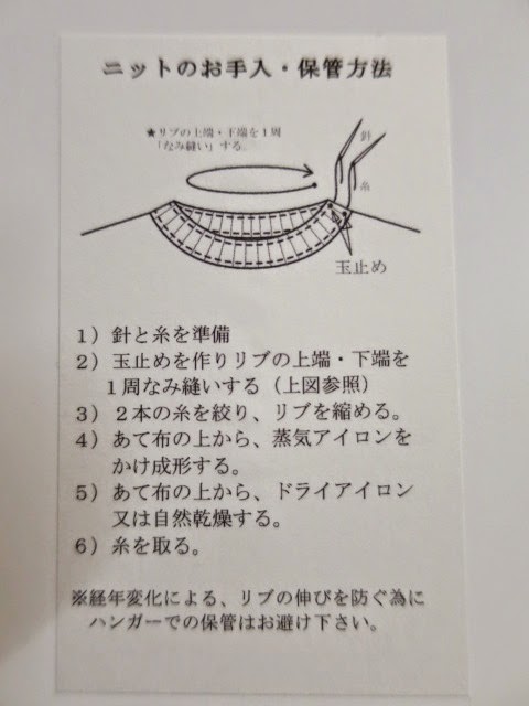 ニットのお手入れ方法が記載されており、ネック、袖先、裾の伸びは改善する事ができますので、長きに渡って着ていただけます。