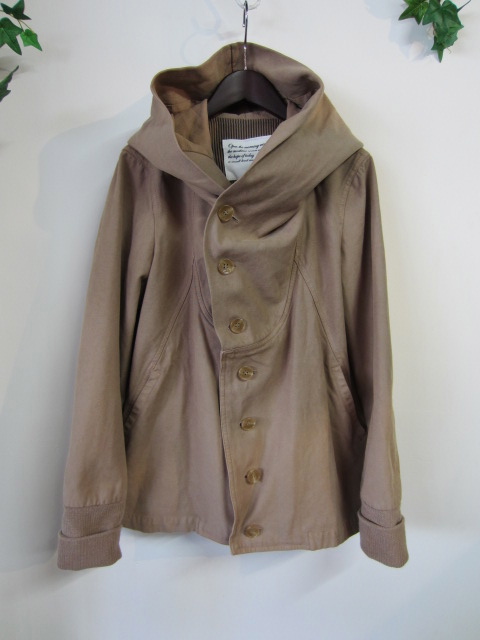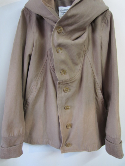アウター級のコットン地のジャケットは、斜めのボタンデザインとフードを含めたシルエットが最高。