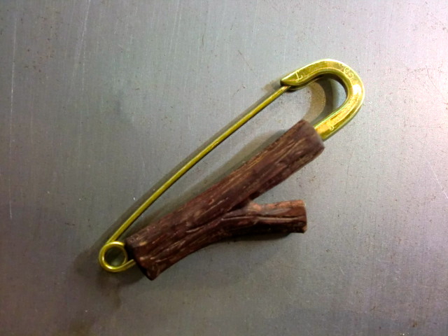紫檀を手彫りで彫刻したウッド付きの安全ピンです。大きさもあるのでストールを止めたり、パンツに付けたり、ネックレスにしたり、と様々な使い方が出来ます。C,L,Sの文字入り。
