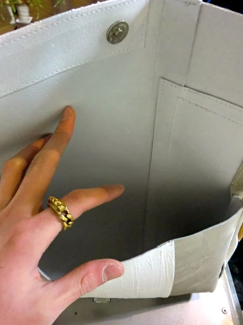 レザーの上に壁に用いるパテを載せており、時が経つにつれ劣化していく壁のように、汚れたり、ひび割れ、剥離等が生じてどんどん変化していきます。