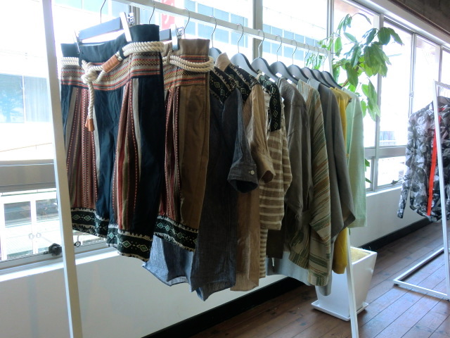 インディアンテキスタイルを用いたアイテム、馬布を用いたベルト付きショートパンツ、パラフィン加工を施した帆布マリントートバッグ。