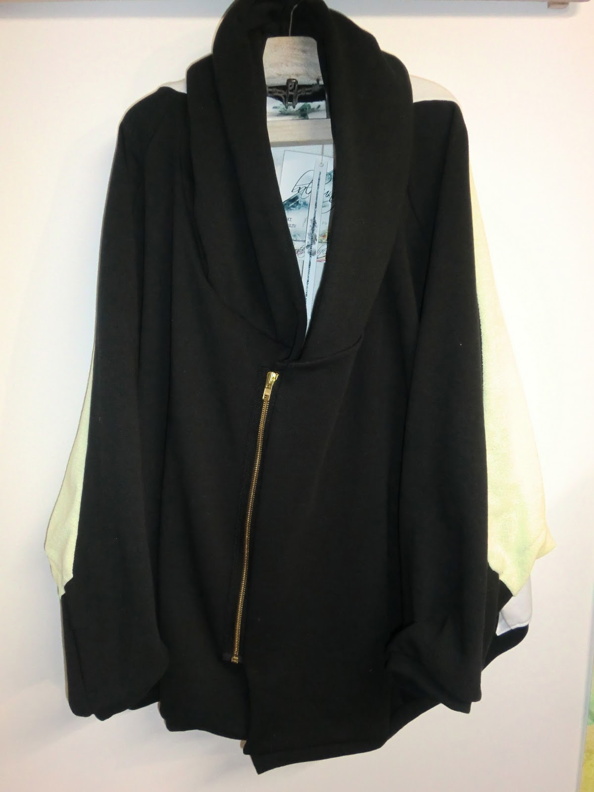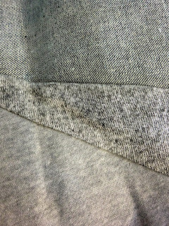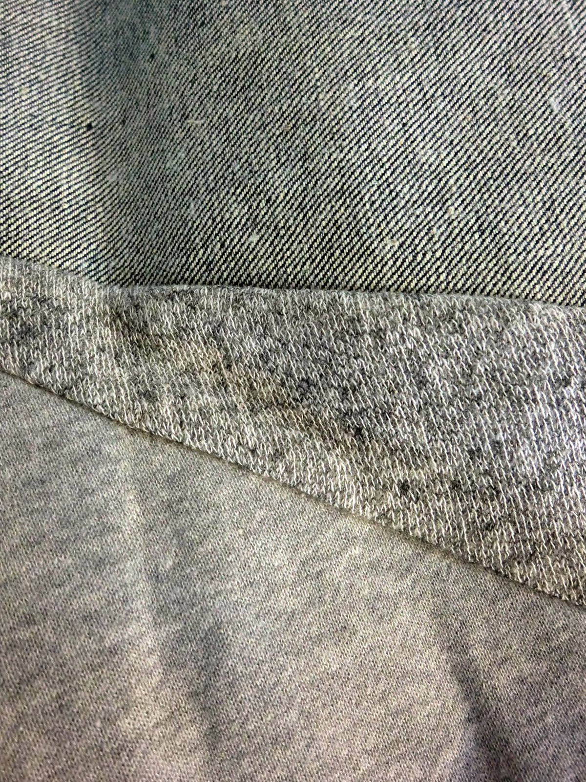 デニムとスエット、ニット地の組み合わせ。 身幅は細身ですがスエットですので伸び感があり、着やすいです。きつめであっても着ていくうちに馴染んできます。