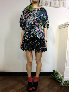袖口は広めの着物スリーブ。前、後ろともに裾付近に、同生地によって4段のひだがついております。1枚で可愛いトップスです!サイズSのみ。