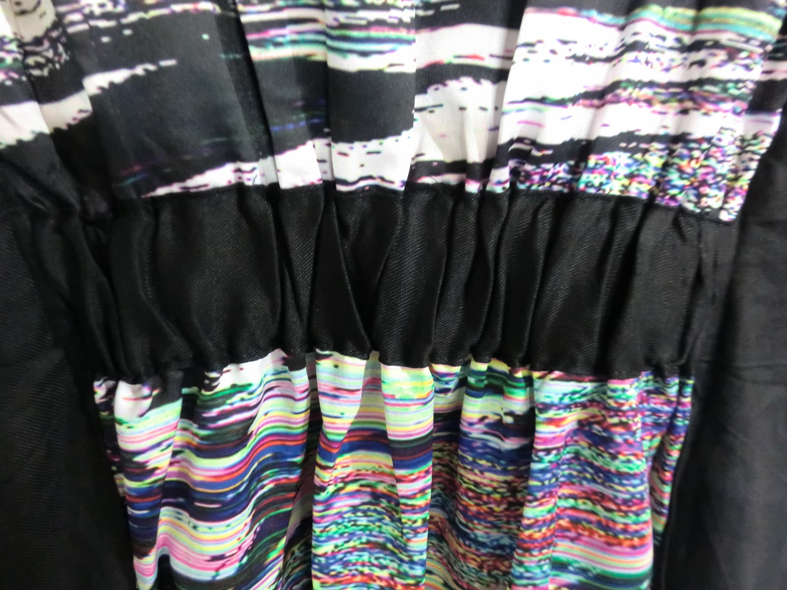 たくさんの色が混じった柄とシルエットが素敵です。ウエストにはドローコード入りで絞ったり、緩めたりできます。バックはゴム仕様。1枚で可愛いワンピです!