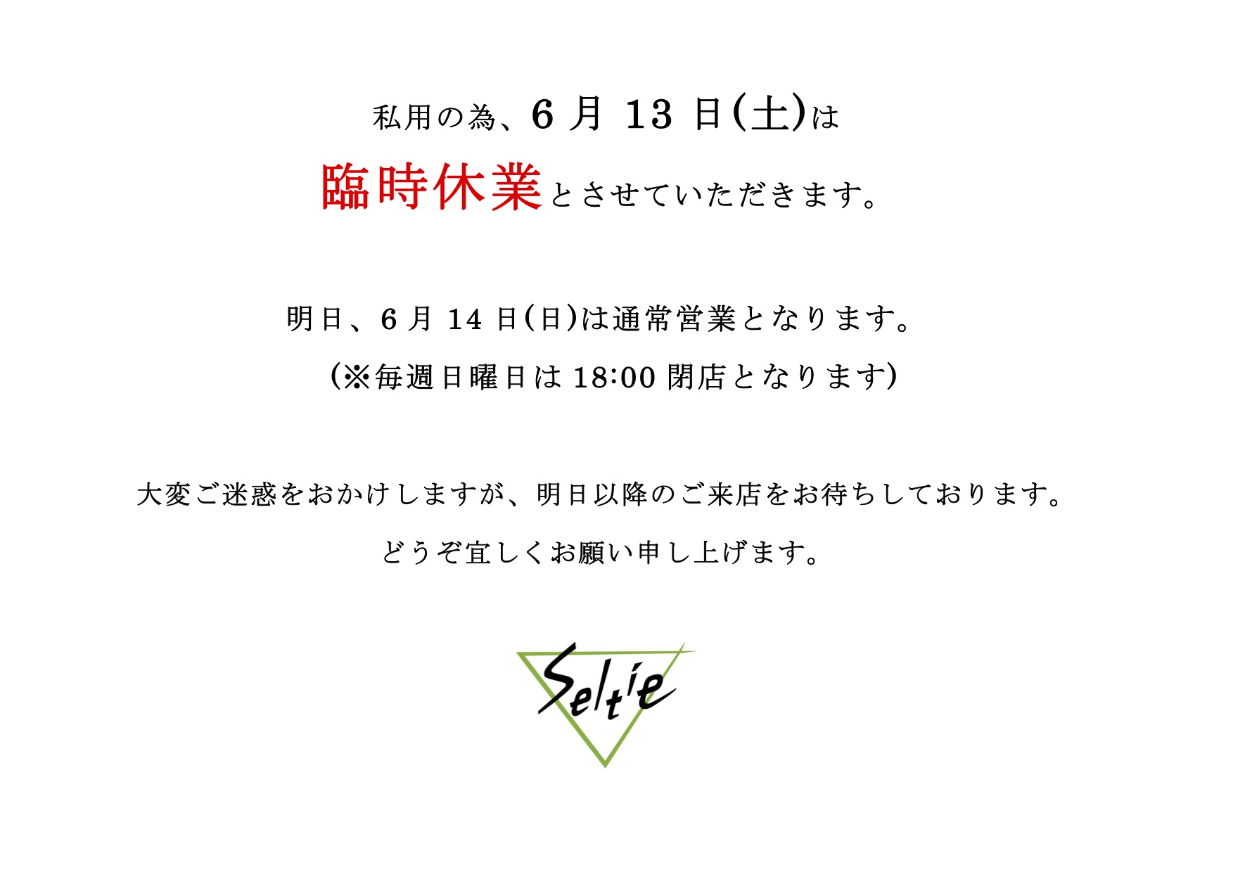 明日6月13日(土)は臨時休業となります。