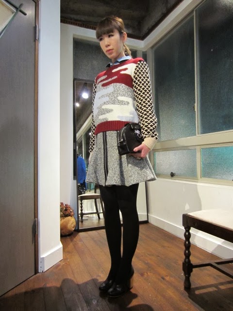 ニットのレッドカラー、バッグとシューズのブラックカラーで引き締めました。