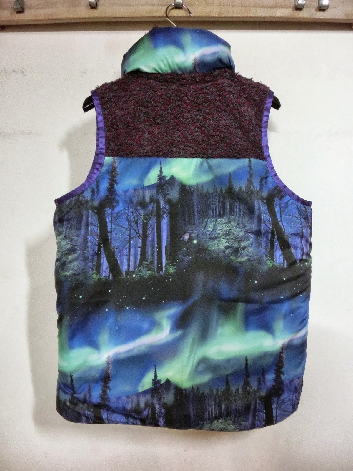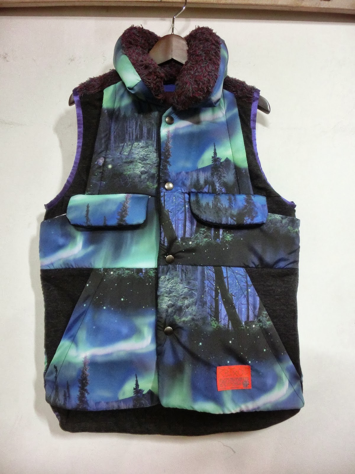 美しい夜の森を描いたテキスタイルが特徴的なキルティングベスト。