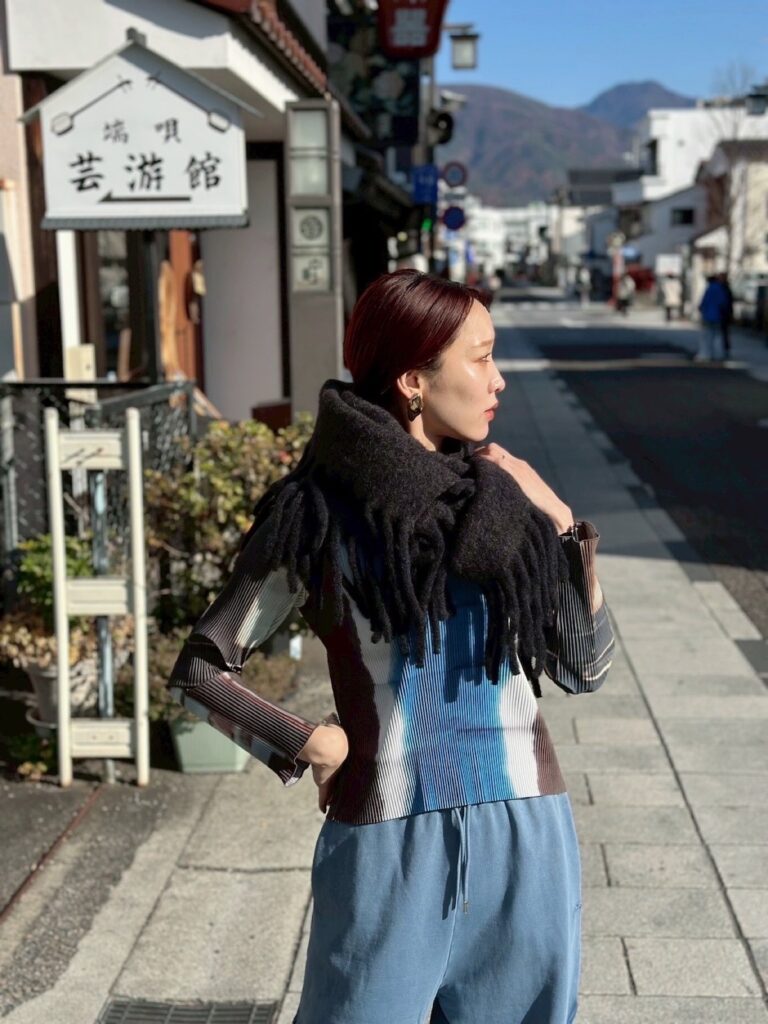 おかげ様で好評いただいておりますAVAVAVのスカーフはムカデからインスピレーションを得ており、四辺全てにフリンジのディテールが施されております。