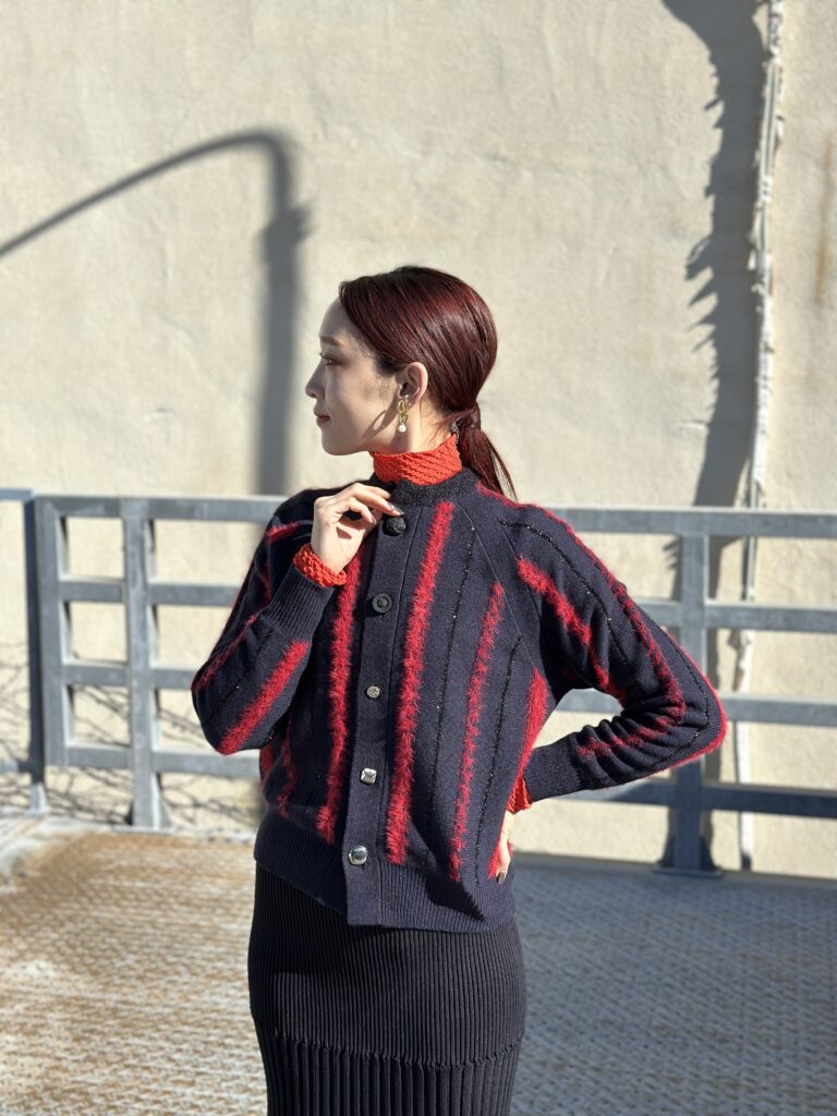 シンプルなボトムにも映える今シーズンおすすめのカーディガンです。