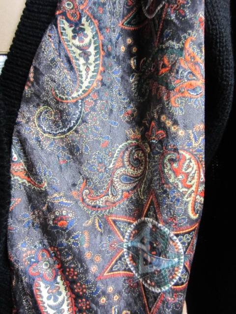 オリジナルペイズリー柄を用いたニットカーデで、ショルダー部に山羊のリアルファーが付いたデザイン。